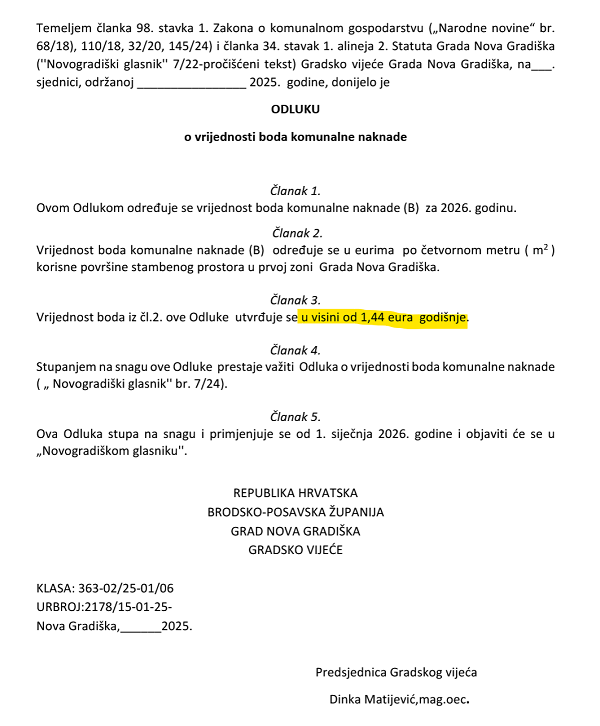 Kako je vidljvo iz dolje izdvojenog dijela iz obavijesti grada Nova Gradiška o "javnom savjetovanju o donošenju prijedloga odluke o vrijednosti boda komunalne naknade" doći će do poskupljenja.