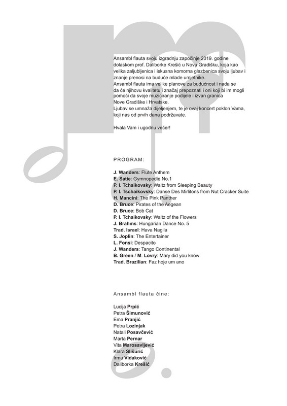 “Ansambl flauta ima velike planove za budućnost i nada se da će njihovu kvalitetu i značaj prepoznati i oni koji bi im mogli pomoći da svoje muziciranje podijele i izvan granica Nove Gradiške i Hrvatske. Ljubav se umnaža dijeljenjem, te je ovaj koncert poklon Vama, koji nas od prvih dana podržavate.” - istaknuto je u najavi koncerta.