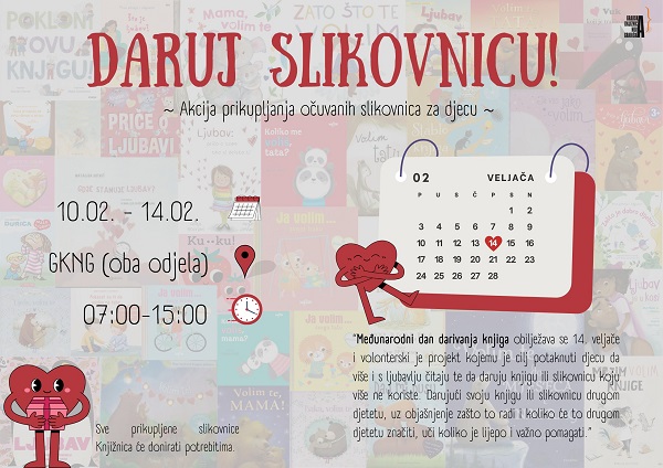 Dragi naši, obzirom da nam se bliži Međunarodni dan darivanja knjiga koji obilježavamo 14. veljače, odlučili smo organizirati akciju prikupljanja slikovnica za djecu. Prikupljene slikovnice ćemo potom proslijediti potrebitoj djeci.