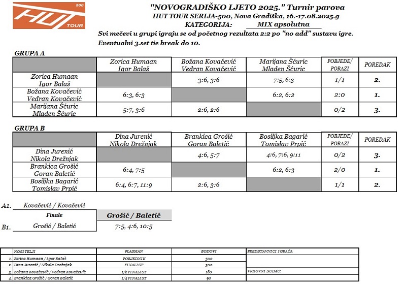 par u sastavu Božana Kovačević (DJ) / Vedran Kovačević (DJ) rezultatom 7:5, 4:6, 10:5.
