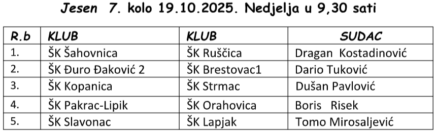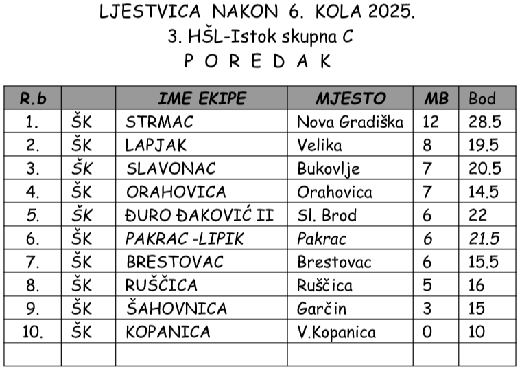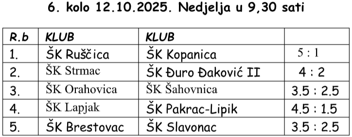 Odigrano je šesto kolo 3.Hrvatske šahovske (međužupanijske lige) u kojoj se natječe deset klubova iz Brodsko-posavske, Požeško-slavonske i Virovitičko-podravske županije.