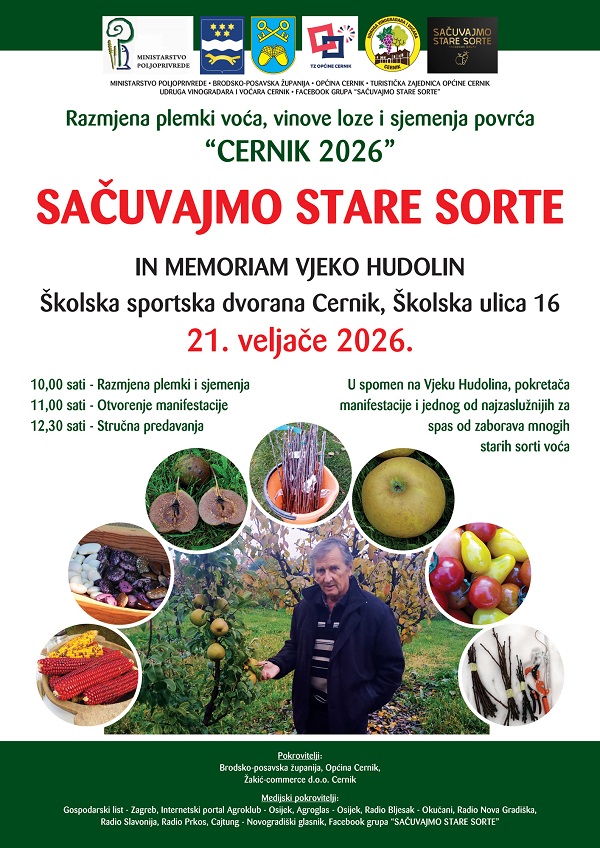 U Cerniku će se i ove godine održati već tradicionalna manifestacija „Sačuvajmo stare sorte – Cernik 2026“, posvećena očuvanju autohtonih sorti voća, vinove loze i sjemenja povrća. Manifestacija će se održati u subotu, 21. veljače 2026. godine, u školskoj sportskoj dvorani Osnovne škole Matija Gubec u Cerniku, s početkom u 10 sati.