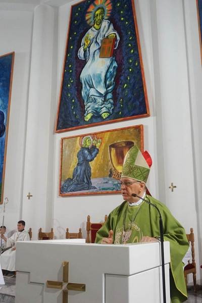 U homiliji biskup je rekao da zajedno sa sudionicima slavlja stoji pred izazovom Božje riječi za koju pisac Poslanice Hebrejima u današnjem drugom čitanju kaže da je živa, djelotvorna, oštrija od svakog dvosjekla mača i prodire dotle da dijeli dušu i duh, zglobove i moždinu, prosuđuje nakane i misli srca i kojoj ništa nije skriveno. Spomenuo je kako ga pogađa činjenica da mi kršćani dajemo nerijetko puno više pozornosti i vremena ljudskim riječima nego Božjoj riječi, oduzimajući joj tako djelatnu snagu u nama. Pozvao je sudionike slavlja da danas zajedno s njime odluče da će Božjoj riječi dati veće značenje u svom životu, odgovarati Bogu da on ima pravo, dopustiti mu da se u našoj svakodnevici očituje njegova snaga i pobijedi njegova moć. Ustvrdio je kako je utješno da se obitelj Mijatović nije ravnala po većinskim ljudskim mišljenjima i govorima koji kod nas vladaju o potomstvu, jer bi tada zaključila da joj je dovoljno imati samo jedno ili možda ni jedno dijete, nego su roditelji u dubini svojih bića osluškivali Božju istinu o braku i opredijelili se za služenje životu i svojim petim dijetom.