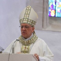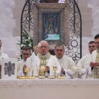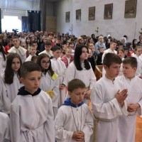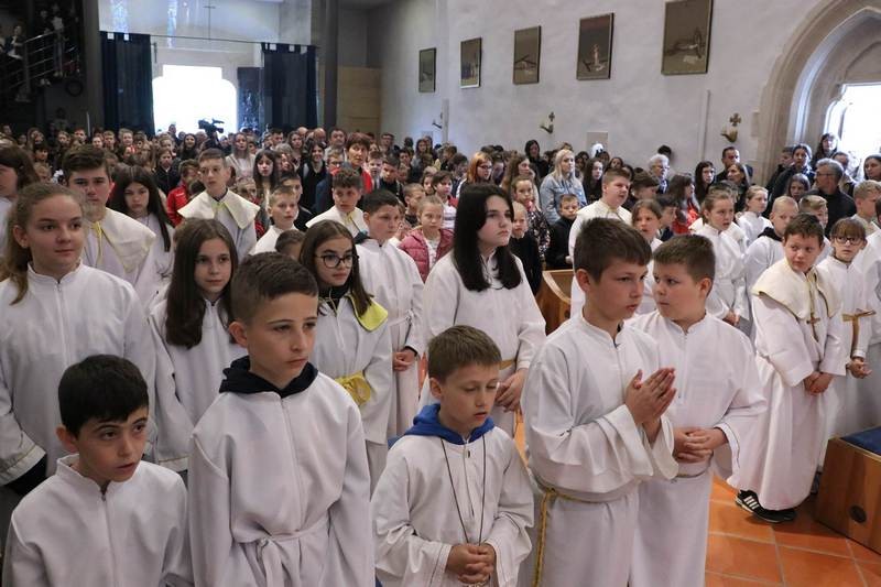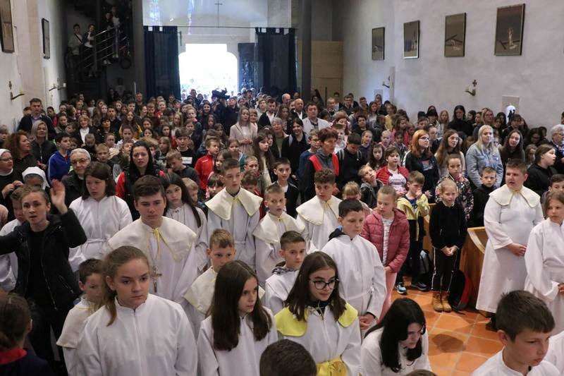Biskup je započeo homiliju rekavši djeci kako mu se čini da je Isus bio ponešto strog prema svojim učenicima u današnjem evanđelju kad ih je pitao: „Hoćete li i vi otići od mene?“ Riječ je o važnom pitanju, ne samo za tadašnje njegove učenike, nego i za nas danas, ustvrdio je biskup. Rekao je djeci da Isus to isto pitanje postavlja i njima, jer možda i oni kao onodobni Isusovi slušatelji žele od njega čuti i prihvatiti samo nešto svoje, a ne što je Božje, drugačije i zahtjevnije od njihova. Izrazio je uvjerenje kako su došli na hodočašće da bi Isusu s Petrom iz današnjeg evanđelja potvrdili: „Kamo da idemo, ti jedini imaš riječi života vječnoga!“ Na biskupov poziv sva nazočna djeca zajednički su ponovila: „Gospodine, ti imaš riječi života vječnoga!“ Radi se o tome, kazao je biskup, do kamo možemo stići s Isusom, a do kamo s onim što mi hoćemo. Isus tumači u današnjem evanđelju kako tijelo ne koristi ništa, i da je duh onaj koji oživljuje, te veli: „riječi koje sam vam govorio Duh su i život“. U tom je izazov, ustvrdio je biskup. Spomenuo je djeci kako su važne riječi koje im učitelji govore u školi, svjedočeći o onom što su ljudi istražili o svemiru, svijetu, nama, što smo susreli na životnome putu. No, to nije dovoljno, jer ljudske riječi dopiru do našega razuma, ali ne dublje. Isusove su riječi duh i život, i jer su božanske prodiru do srca da bi nas oživjele. Svojom riječju Isus unosi u nas svoj Duh koji nas oživljuje da postajemo više od tijela, pobjednici s njime nad smrću, kazao je biskup. Dodao je kako se čudi da onodobni Isusovi slušatelji nisu razumjeli da je sve naše ljudsko kratkoročno te u njegovu govoru prepoznali riječ koja oživljuje naše srce i daruje život. Kazao je nazočnoj djeci da su spomenuti Isusovi slušatelji napravili krivu procjenu kad su njegovoj riječi pristupili samo razumski a ne vjerom koja je mjerilo srca za ono što Bog može ostvariti više nego li mi a za čim čezne naše srce.