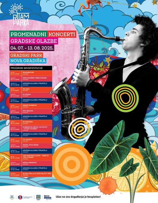 Nakon izvrsnog programa manifestacije Volim ljeto i kulturu, nastavljamo uživati u našem parku uz promenadne koncerte Gradske glazbe Nova Gradiška i gostujuće izvođače – svakog vikenda čeka vas večer za pamćenje. Od domaćih bendova, tribute nastupa, jazza i akustike do prepoznatljivih glazbenih imena – program je raznolik, a dobra atmosfera zagarantirana