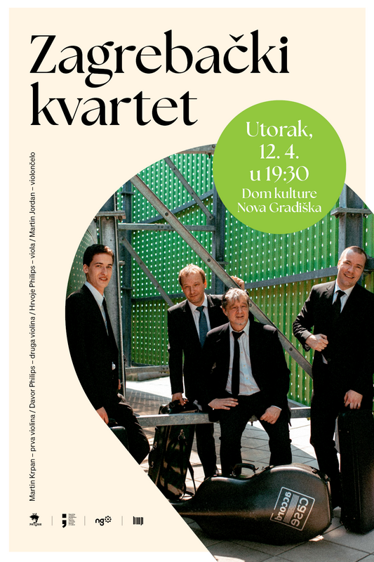Iz novogradiškog Doma kulture najavljujeu koncert Zagrebačkog kvarteta koji čine vrhunski hrvatski glazbenici. Kvartet će nastupiti u sastavu: Martin Krpan, prva violina, Davor Philips, druga violina, Hrvoje Philips, viola i Martin Jordan, violončelo. Koncert je i edukativnog karaktera, pogodan svim uzrastima, a ostvaren je uz potporu Ministarstva kulture i medija RH I Grada Nova Gradiška.