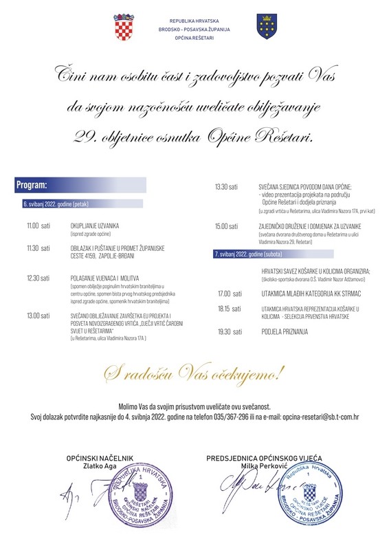 Program će započeti 6. svibnja u 11 sati okupljanjem uzvanika ispred zgrade općine, a zatim će uslijediti obilazak i puštanje u promet Županijske ceste 4159. Zapolje – Brđani, polaganje vijenaca i molitva, svečano obilježavanje završetka EU projekta i posveta novoizgrađenog vrtića „Dječji vrtić Čarobni svijet u Rešetarima”, svečana sjednica te zajedničko druženje na domjenku za uzvanike.